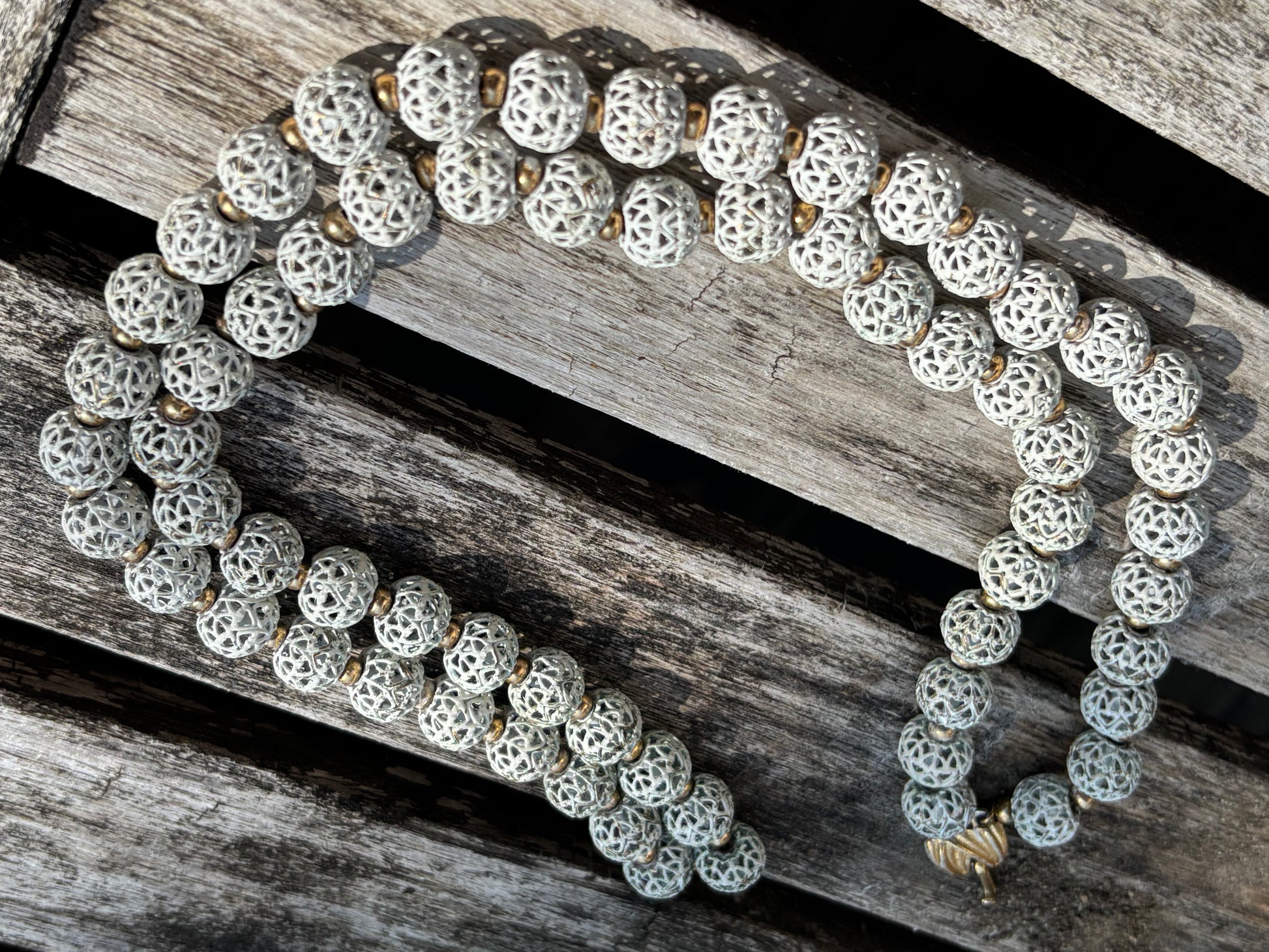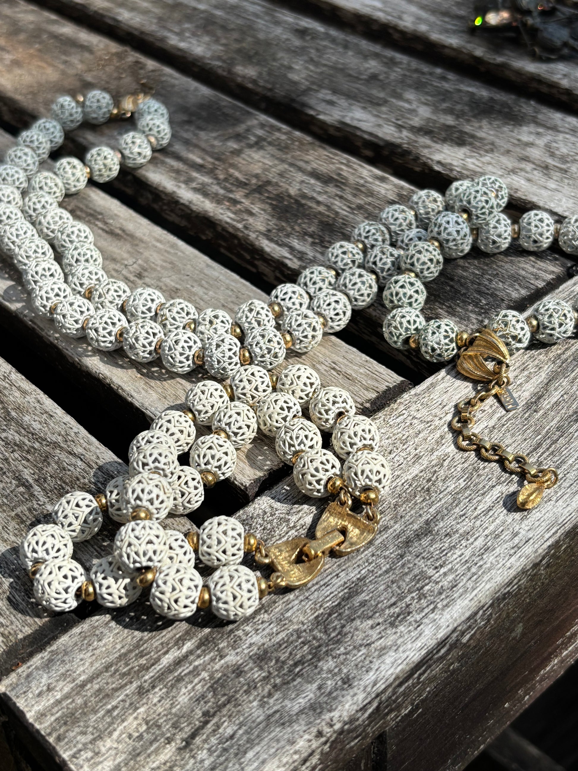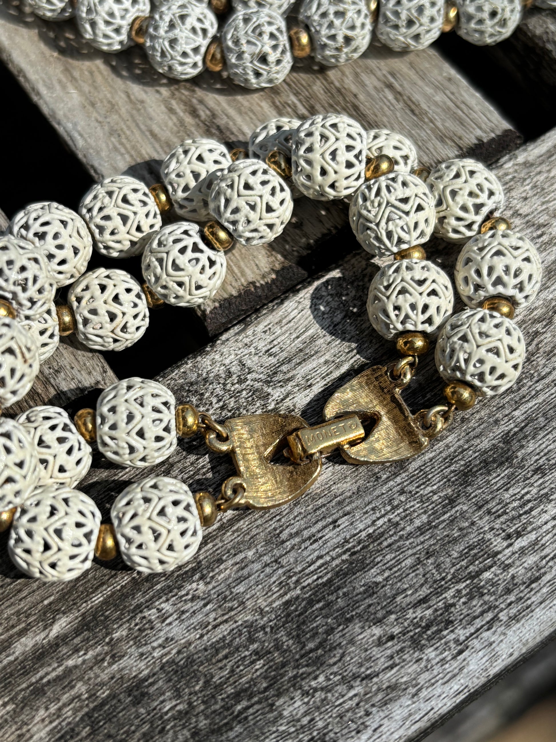 vintage Monet white enamel filigree beaded necklace and matching bracelet Georgette design